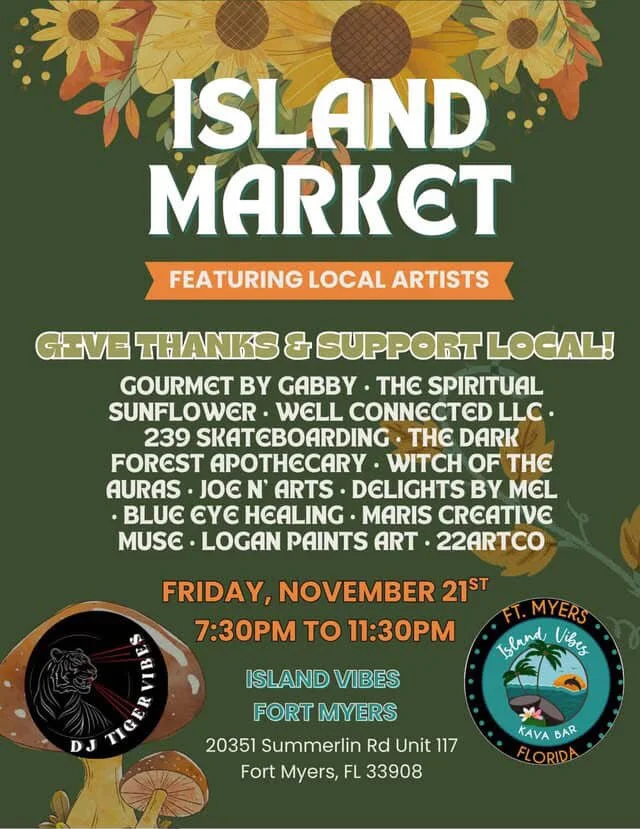 We are participating in a Parking Lot Market and Party at Island Vibes Kava Bar in Fort Myers, Florida. Let’s come together, give thanks, and support local vendors! We will be alongside amazing vendors such as Gourmet By Gabby, the Spiritual Sunflower, Well Connected, 239 Skateboarding, Blue Eye Healing, and many more amazing vendors!